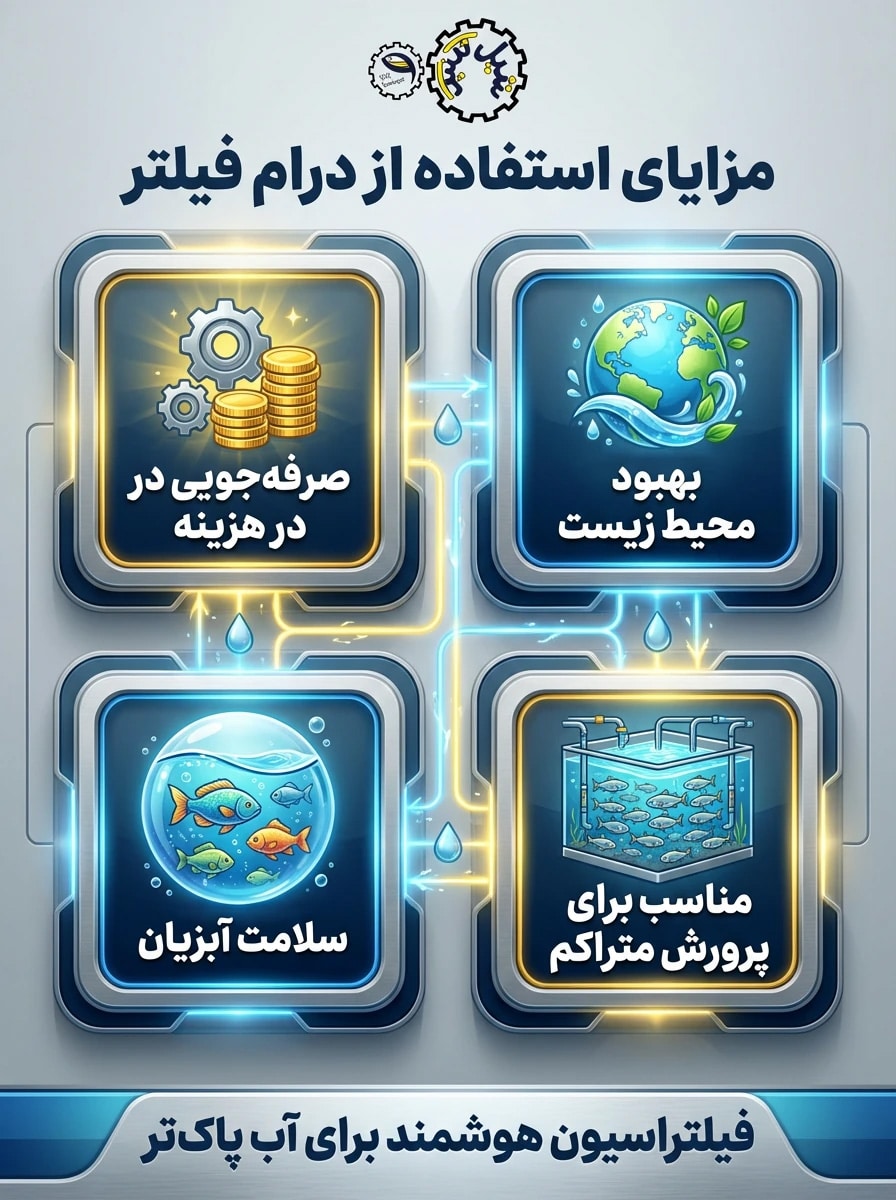 استفاده از دستگاههای درام فیلتر در محیطهای پرورش ماهی از مزایای زیادی برخوردار است، از جمله بهبود کیفیت آب، کاهش آلودگی محیطی، افزایش رشد و سلامت ماهیان، کاهش هزینههای نگهداری و تعمیرات، و افزایش بهرهوری و سودآوری واحدهای پرورشی. بهطور کلی، دستگاه درام فیلتر یکی از ابزارهای حیاتی در صنعت پرورش آبزیان است که نقش مهمی در بهبود شرایط محیطی و اقتصادی این صنعت دارد.
